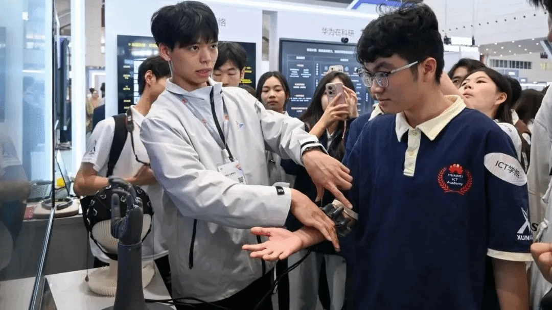 随后,研学团来到华为脑机接口专区,探索华为脑机接口独角兽用意念控制未来的奥秘。beat365官网研学团成员何柏雨亲身体验了华为脑机接口设备的演示,对只需“想一想”就能操控设备完成指令的神奇功能惊叹不已。他感慨道:“这次大会让我深刻认识到,脑机接口技术不仅是科技领域的重大突破,更是人类与机器融合的新开端。”
