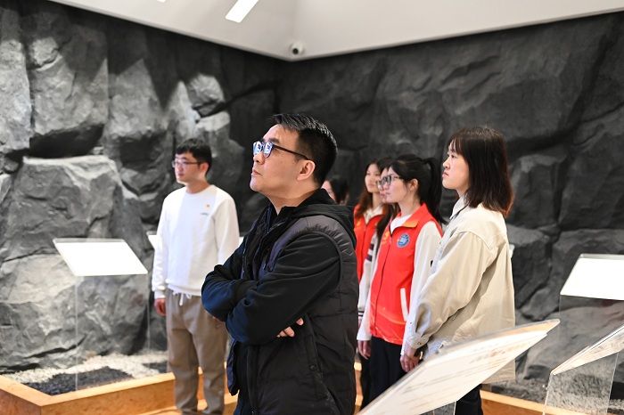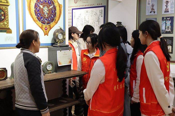 鼎湖区博物馆副馆长肖沛首先带领师生们到博物馆二楼展厅。展厅内通过展示三维立体科普展板和鼎湖区地形地貌模型,向大家宣传介绍生物多样性的重要意义。肖馆长聚焦生物安全,向师生们阐述濒危物种案例和生态链的发展,使大家更深刻地认识到守好生物多样性与筑牢生态安全屏障的重要性。随后,师生们跟随三楼讲解员市级非遗传承人余彩英女士进入三楼。三楼是非物质文化遗产肇庆自鸣钟—利玛窦钟表文创基地。通过聆听自鸣钟的故事,师生们领悟到先辈们在推动科研事业发展的艰辛历程,在回顾历史中汲取精神力量,进一步坚定了初心使命。