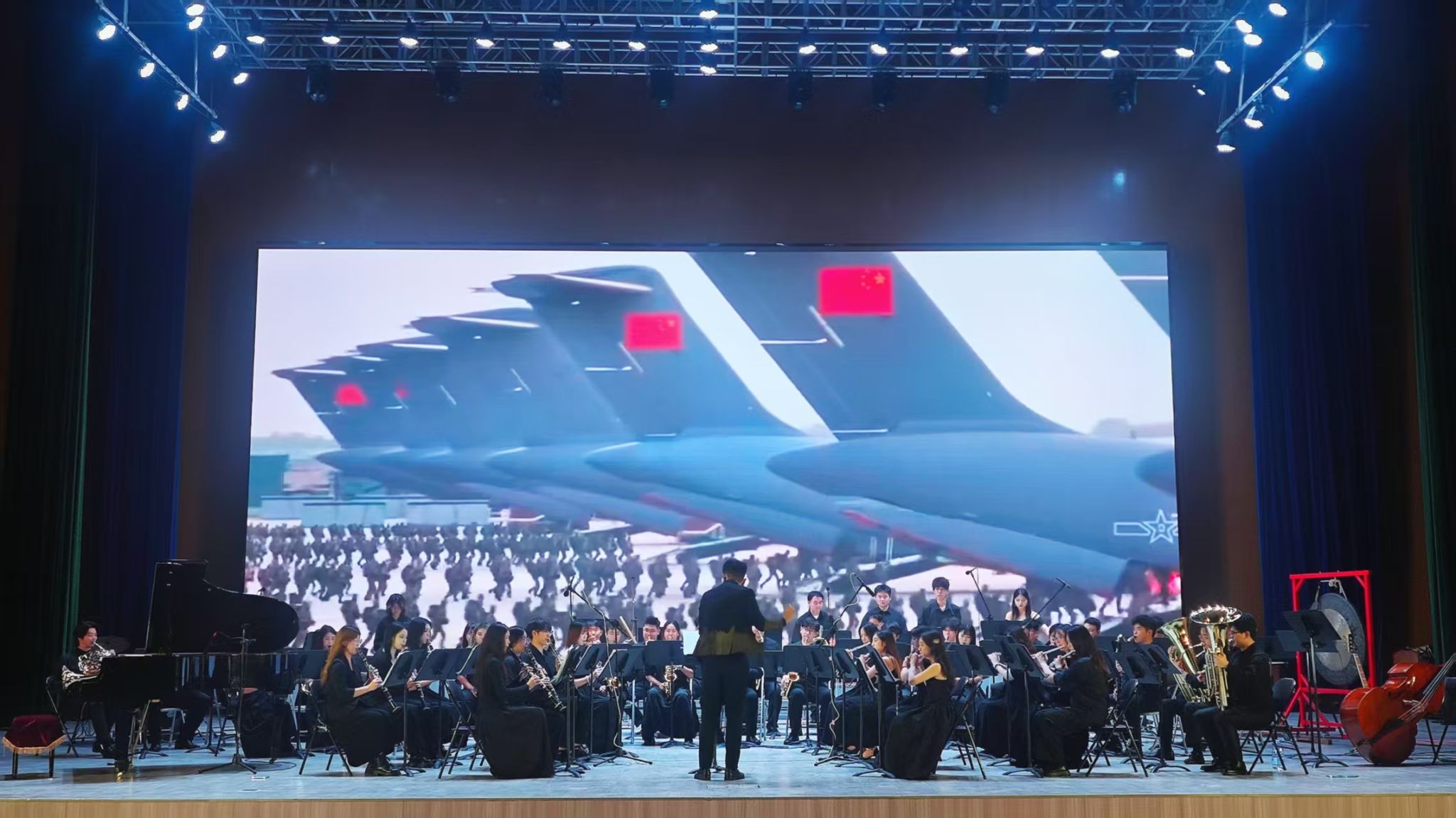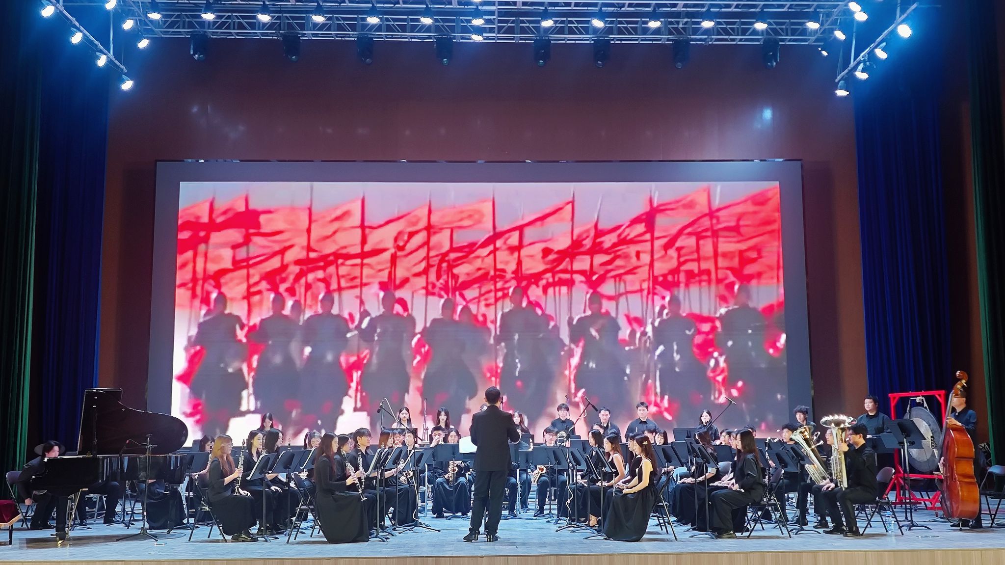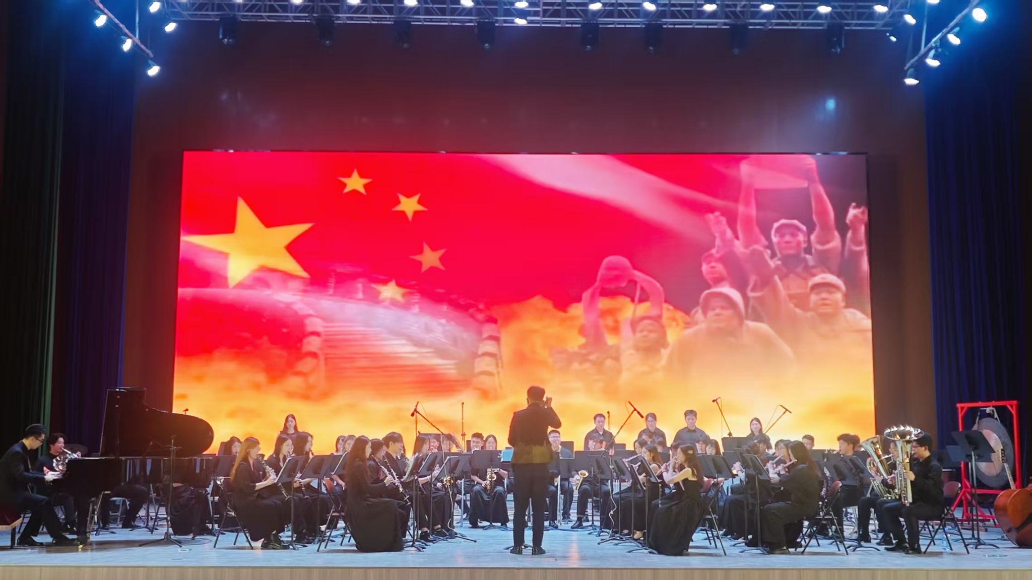 演出在《红旗颂》的磅礴旋律中拉开帷幕,经典之声如江河奔涌,点燃全场热忱。随后,《古代英雄传奇》以恢宏编曲勾勒金戈铁马的壮阔画卷;《我的祖国》深情流淌,唤起对山河的无限眷恋;《当那一天来临》铿锵激昂,传递坚定信念;《保卫黄河》以号角般的旋律将现场氛围推向高潮,令人热血沸腾。