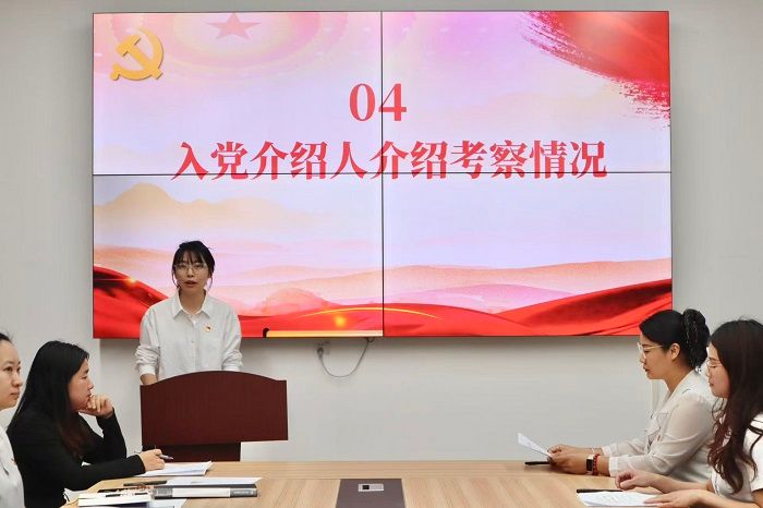 紧接着,入党介绍人分别介绍了对预备党员的培养教育情况,对预备党员考察期间的表现给予肯定,同时对预备党员转正表明了意见。随后,支部委员会代表上台向大会报告对预备党员的考察、审查情况。