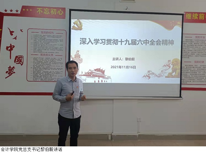 本网讯(会计学院 新闻中心吴玉萍)为深入学习贯彻党的十九届六中全会精神,11月16日下午,会计学院在7303开展学习交流会。会议由会计学院教工党支部书记郑春晓主持。党总支书记黎伯毅领学。