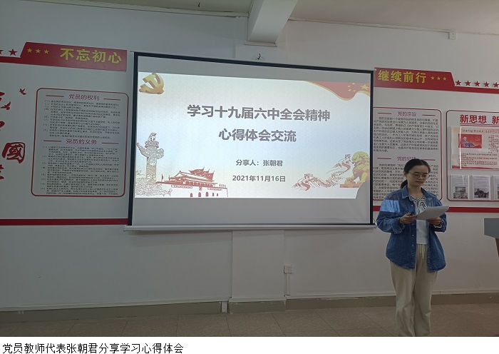 党员教师代表张朝君老师就学习党的十九届六中全会精神分享心得体会。她表示,作为教育工作者,要深入了解党百年奋斗的历史成就和历史经验,认真做好教学管理工作,努力将党的伟大精神融入课堂教学中。