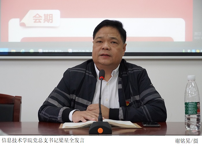 本网讯(信息技术学院 林淑卿)11月16日,信息技术学院在振华楼203室召开学习贯彻党的十九届六中全会精神专题学习会,党总支书记梁星全主持,全体教职工参加。