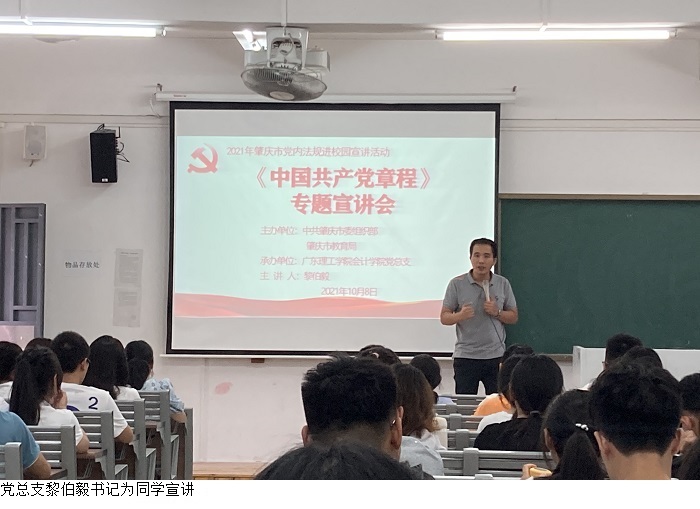 本网讯(会计学院)为增强党性修养,切实提高学生对党史学习的自觉性和主动性,会计学院在党总支的组织和部署下,于2021年10月8日上午在鼎湖校区7403教室开展《中国共产党章程》专题宣讲会。此次会议由会计学院党总支黎伯毅书记主持,党总支徐永明副书记、学生第一党支部郭凤玮书记、21级各带班辅导员老师以及21级各班级干部代表参会。