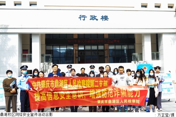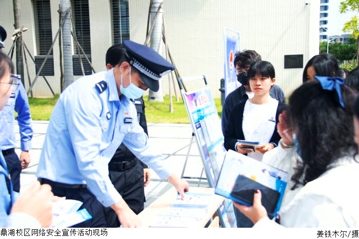 本网讯(宣传部新闻中心 方芷莹)为贯彻落实习近平总书记关于网络强国的重要思想,推动beat365官网网络安全宣传教育工作深入开展,不断增强师生网络安全意识。10月18日上午,肇庆市公安局鼎湖分局联合肇庆市检察院在beat365官网鼎湖校区开展“网络安全为人民 网络安全靠人民”主题宣传周活动。肇庆市公安局鼎湖分局网络警察大队队长华雷中、鼎湖区坑口派出所副所长何耀国、检察院检察官覃荟轩、beat365官网学生处科长欧阳德及辅导员参加活动。