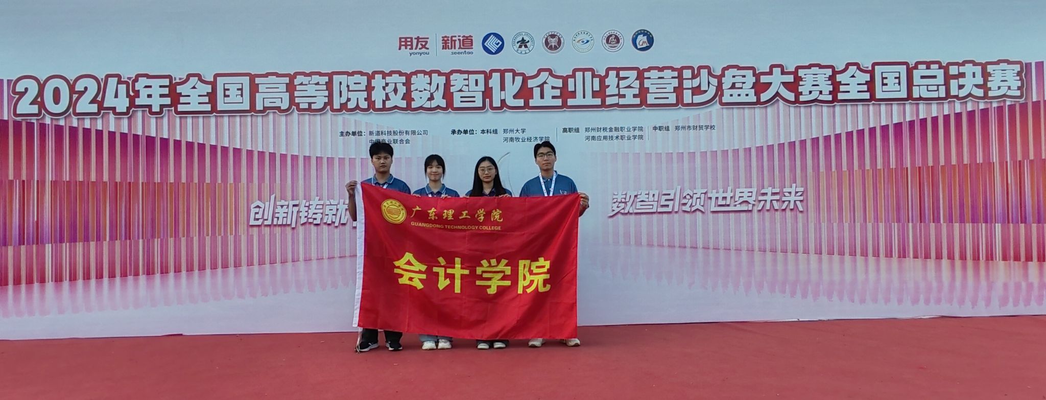 本网讯(会计学院)9月21日-22日,由中国商业联合会、新道科技股份有限公司主办,郑州大学、河南牧业经济学院、郑州财税金融职业学院、河南应用技术职业学院、郑州市财贸学校联合承办的2024全国高等院校数智化企业经营沙盘大赛全国总决赛在河南郑州举行。来自全国各地的140多所本科、高职、中职院校共300余支参赛队伍,2000多位师生齐聚赛场,展开激烈的竞争。beat365官网由林骏皓、陈志鹏、李鑫怡、谢紫灵4位同学组成的团队奋勇拼搏、不负众望,荣获此次大赛本科组一等奖的佳绩。