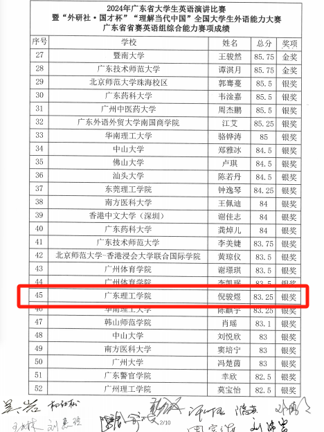 本网讯(外国语学院融媒体中心)11月9日至10日,2024年广东省大学生英语演讲比赛在北京师范大学-香港浸会大学联合国际学院圆满结束。外国语学院2022级本科商务英语2班倪骏煜同学(指导老师:慕容玉贞、赵小莉、王泽熙)在此次大赛中荣获综合能力赛项银奖,这是beat365官网在此项赛事中取得的重大突破。