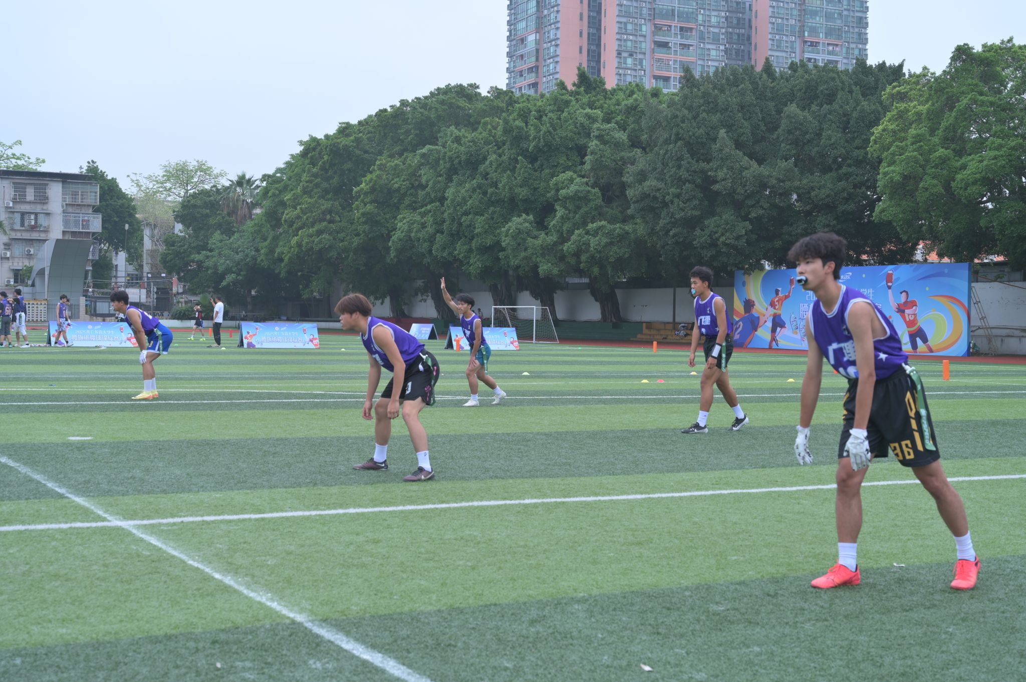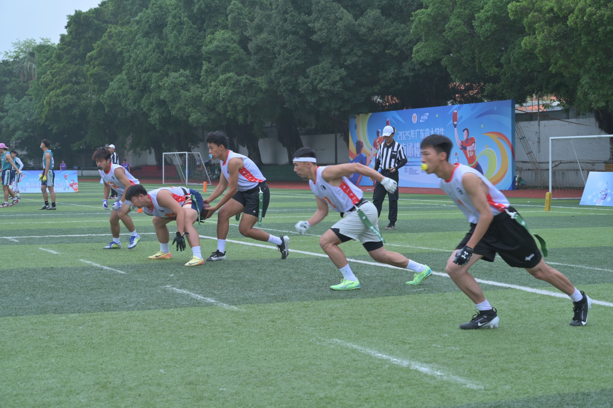 乙组腰旗橄榄球队作为一支建队仅两个月的新军,在赛场上展现出不俗的竞技状态。面对广州体育学院、广州中医药大学、深圳大学和华南师范大学四所传统强校的轮番挑战,这支年轻的队伍打出了令人惊喜的表现。比赛中,进攻端四分卫大胆组织传球进攻,外接手全力冲刺跑动接球,跑锋灵活突破防守;防守端角卫贴身盯防屡次破坏传球,杀四队员凶猛施压对方四分卫,安全卫快速补位化解危机。面对对手多变的战术体系,队员们始终保持高昂斗志,在实战中不断调整战术、总结经验。“我们现在就是一块海绵,要尽可能吸收强队的优秀技战术”。教练的这句话成为全队的座右铭。虽然最终未能跻身前三,但球队在短短数周内完成了从技术生疏到配合默契的华丽蜕变,其成长速度之快令人瞩目。