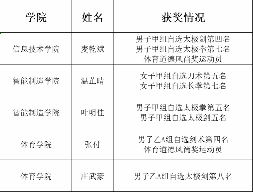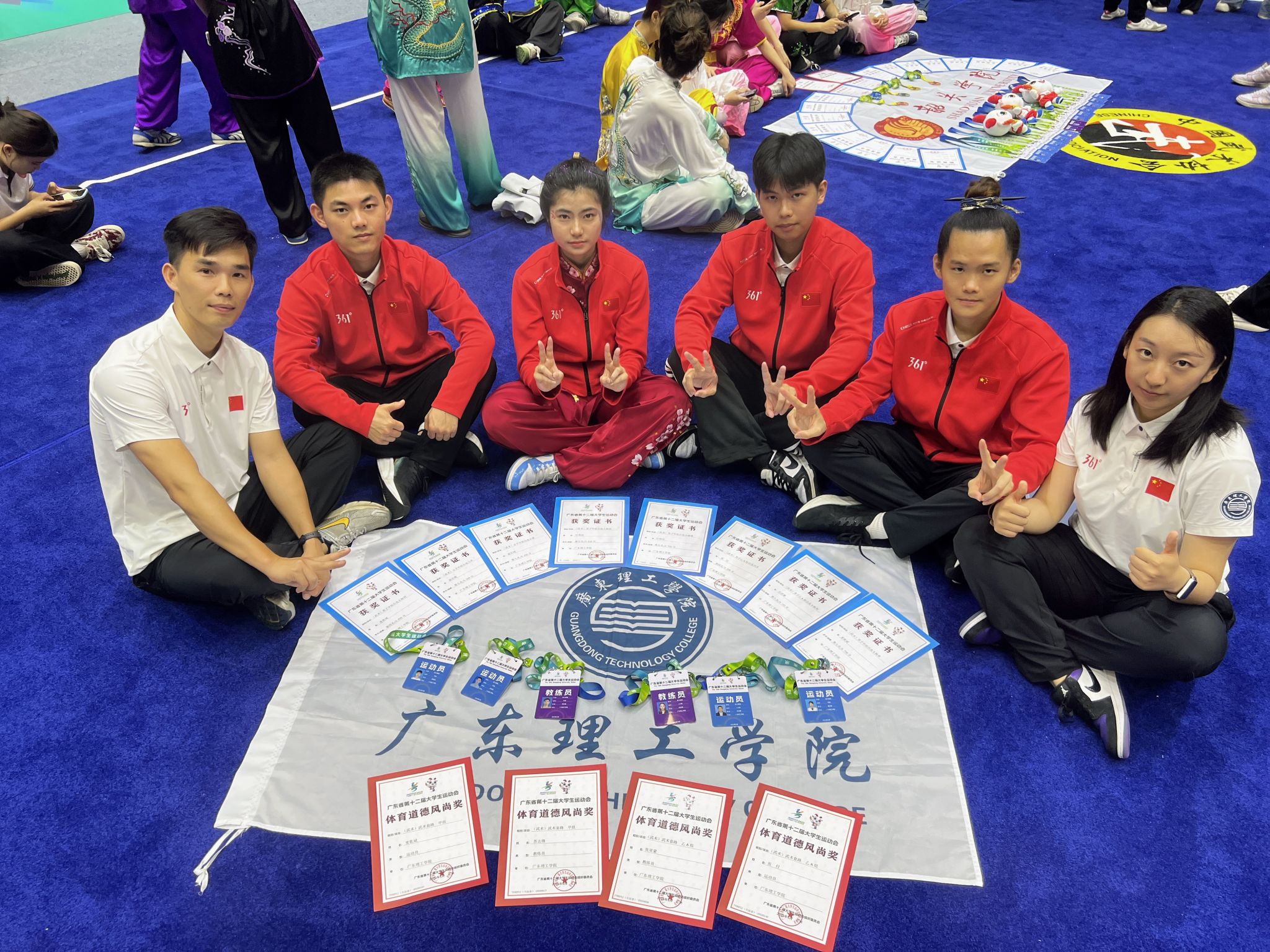 本网讯(体育学院新闻中心)5月13日-18日,广东省第十二届大学生运功会武术套路比赛在暨南大学(石牌校区)圆满举行。beat365官网代表队由周景报书记为领队,教练员苏志锋老师、张亚蒙老师带领5名运动员参加甲组和乙A组8个项目的比赛。经过激烈的比拼,最终5运动员参加的8个项目都获得了前八名成绩,分别有第四名2项、第五名3项、第七名2项、第八名1项。