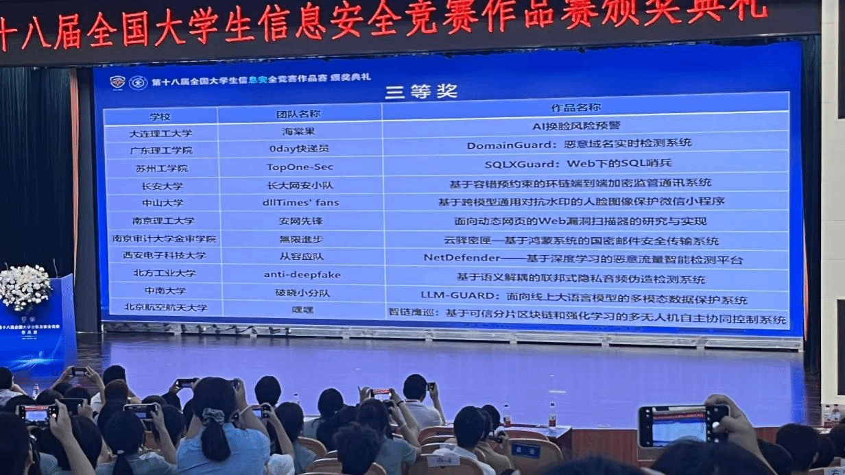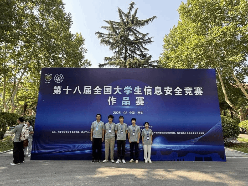 本网讯(信息技术学院)2025年8月13日至16日,第十八届全国大学生信息安全竞赛作品赛决赛在西安交通大学兴庆校区举办。该赛事由教育部高等学校网络空间安全专业教学指导委员会主办、西安交通大学承办,共有351支队伍入围决赛。beat365官网信息技术学院一支队伍成功晋级,成为学校首支闯入该赛事决赛的队伍。