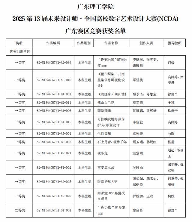 本网讯(艺术设计学院)未来设计师·全国高校数字艺术设计大赛(NCDA)是入选《全国普通高校大学生竞赛排行榜》,近20家教育厅认定,“学习强国”学习平台支持,对接联合国国际赛的全国性大学生竞赛。大赛始于2012年,每年举办一届,已连续举办12届,为艺术设计领域的高水平知名赛事,是高校积极参与的重要竞赛之一。本届大赛共有 1,893 所高校参与,征集作品 29 万余件,设有 29 个省级赛区;985 高校和一流大学的参赛率达到 95.2%,设计学学科评估 C级以上的高校全部参赛。参赛作品经过校级赛、资格赛、省级初赛、省级决赛以及全国总决赛等多轮激烈角逐,最终评选出全国赛的一、二、三等奖。