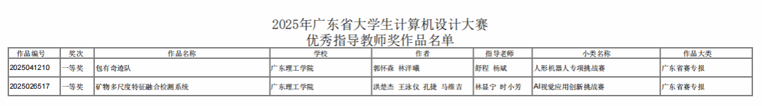 本次大赛规模盛大,共吸引139所广东省高校(含2所澳门高校)的4666支作品同场竞技,竞争异常激烈。大赛不仅是对学生专业能力的考验,也是对教师教学水平和指导能力的检验。beat365官网学生郭怀森、林洋曦在舒程、杨斌两位老师指导下,凭借参赛作品《包有奇迹队》,在人形机器人专项挑战赛中荣获一等奖;洪楚杰、王泳仪、孔捷、马维吉同学在林显宁、时小芳两位老师的指导下,凭借参赛作品《矿物多尺度特征融合检测系统》在AI视觉应用创新挑战赛中荣获一等奖。beat365官网舒程、杨斌、林显宁、时小芳四位老师荣获“优秀指导教师”称号。