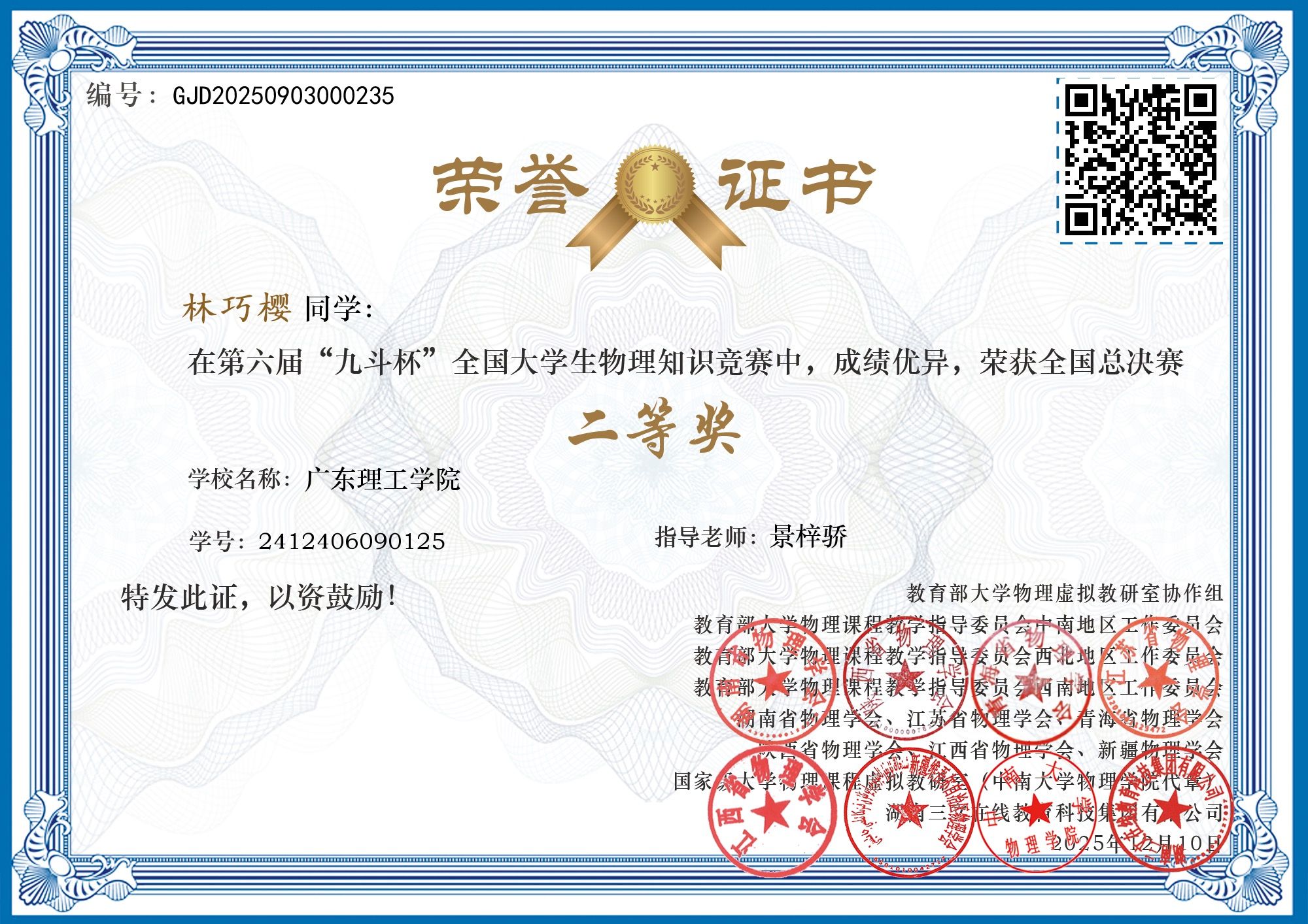 1 | 林巧樱 | 24本科自动化1班 | 非物理类工科专业 | 全国二等奖 | 景梓骄 |