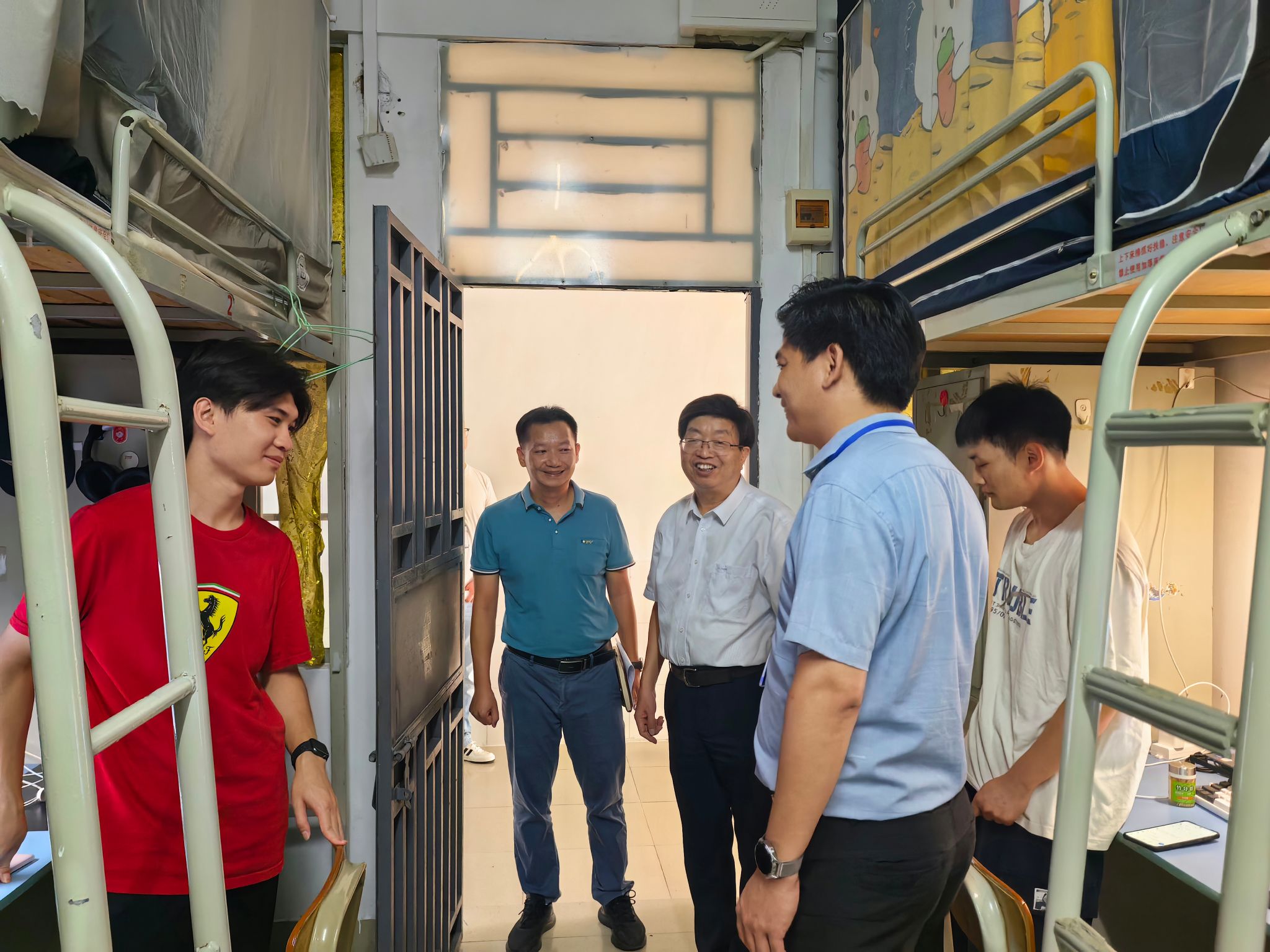 本网讯(宣传部)9月22日下午,学校领导班子分成五个小组,在二级学院书记和辅导员的陪同下,走进学生宿舍,与同学们面对面亲切交流,为同学们带去诚挚的问候与勉励。每走进一间宿舍,校领导细致地查看住宿环境,亲切地与同学们交谈,详细了解大家开学以来的学习适应情况、日常生活需求以及课外活动参与情况。“来自哪里?”“专业学习有没有困难?”“饮食还习惯吗?”一句句朴实而真诚的关心,拉近了师生之间的距离。交流中,...