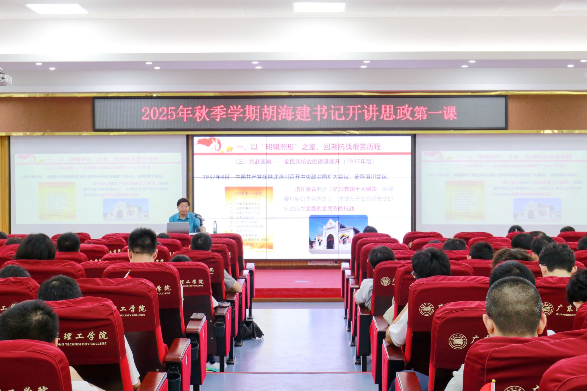 本网讯(新闻中心 李官衡/洪焕桐)为引导青年学子铭记抗战历史、传承红色基因。10月15日,校党委书记胡海建在高要校区42101以“弘扬伟大抗战精神,书写无愧于时代的青春篇章”为题,为在校师生讲授“思政第一课”。课程围绕“明镜照形,回溯抗战艰苦历程”“薪火相传,弘扬伟大抗战精神”和“前事不忘,展现大国责任担当”三个方面展开深度讲解,带领青年学子在历史与现实的交汇中感悟初心使命,在精神传承中锚定青春方向。课堂...
