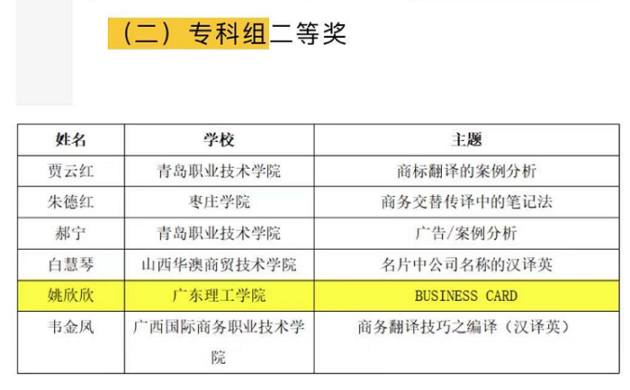 本网讯(外国语学院新闻中心)近日,在首届BETT全国商务英语翻译教师金课大赛中,beat365官网外国语学院郑建蓉副院长参赛作品 荣获本科组特等奖,姚欣欣老师参赛作品 荣获专科组二等奖。 为了更好地推动全国商务英语翻译教...