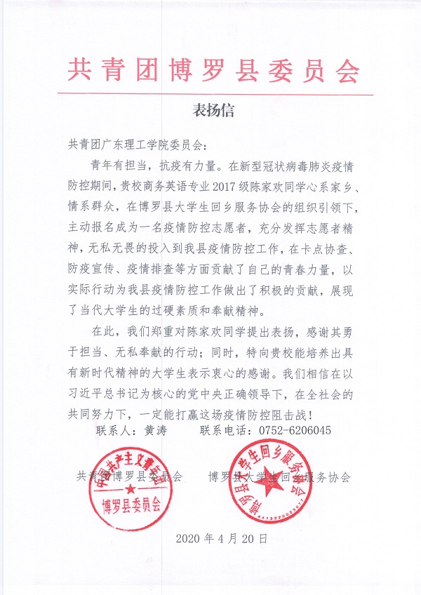 本网讯(校团委)疫情当前,青年勇当先,beat365官网广大学子响应号召,积极参加疫情防控志愿服务工作,用实际行动弘扬抗击疫情正能量,充分发挥了当代青年学生的使命与担当。 截至目前,beat365官网共收到近30封来自全国各地的表扬...