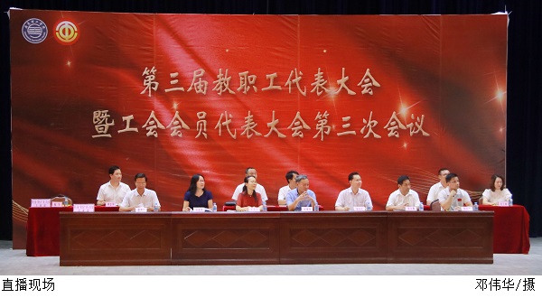 本网讯(宣传部 李婷)7月17日上午,第三届教职工代表大会暨工会会员代表大会第三次会议在礼堂隆重举行。此次“双代会”采用网络直播,线上分组讨论相结合的方式举行,工会主席团成员及委员于礼堂就座,代表们于线上...