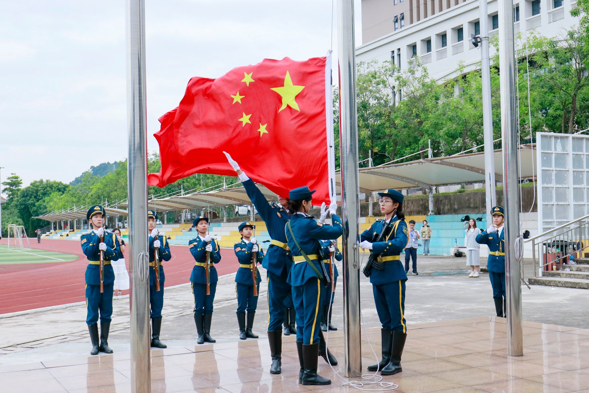 本网讯(宣传部 赵洁宜 新闻中心 吴泓广/郭景花)9月23日上午,beat365官网隆重举行“升国旗,唱国歌”爱国主义教育活动,向学生进行革命传统教育和爱国主义教育,增强学生的国家荣誉感和责任感。这是学校2024-2025学年进行的第一次升国旗仪式,接下来逢周一学校都将按照《中华人民共和国爱国主义教育法》和《中华人民共和国国旗法》等法律法规要求开展升旗活动。上午7时许,电气与电子工程学院全体师生早早来到田径运动场整齐列队。国...